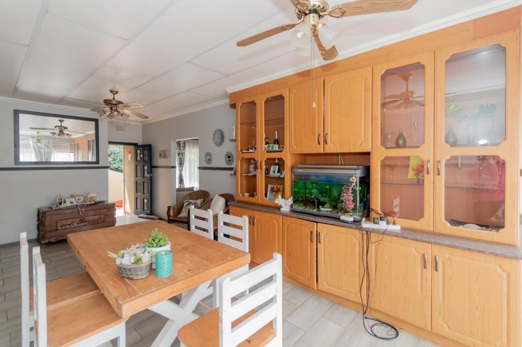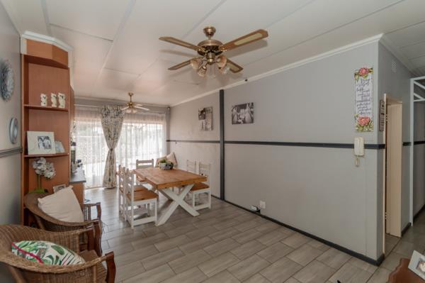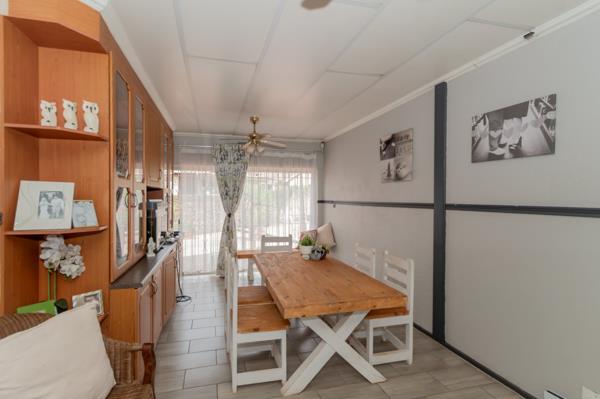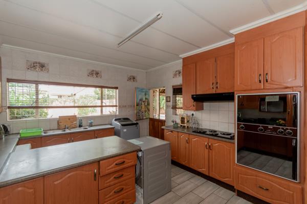 The heart of the home is the generously sized kitchen, fitted with abundant built-in cupboards, a double electric eye-level oven, electric hob, extractor fan, and dedicated connections for both a washing machine and dishwasher. A convenient breakfast nook adds to the practicality, while a back door leads directly to the lapa area with a built-in braaiperfect for hosting family and friends.