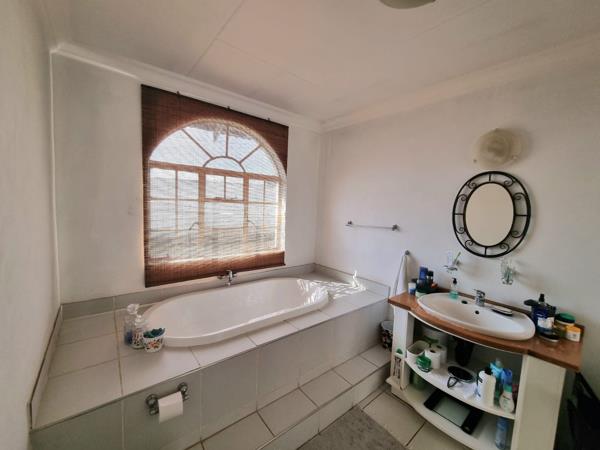 2 Bathrooms PLUS a guest toilet. 1ste Bathroom features a huge bath, basin and toilet. 2nd Bathroom is a full en-suite. Guest toilet in the dining room. Inviting patio overlooking the back garden is accessible from the main bedroom.