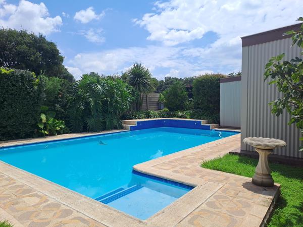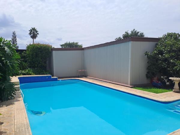 Property offers kitchen, lounge / dining room, family room, 4x bedrooms, 2 bathrooms (M.E.S.), veranda, laundry, covered parking for 9 vehicles, large pool, 36 sqm storage / workshop, variety of fruit trees, back up water, built-in-braai, alarm, remote entrance with intercom, electric fence, PLUS 1 bedroom flat on a 1487 m/2 stand.