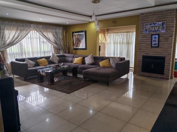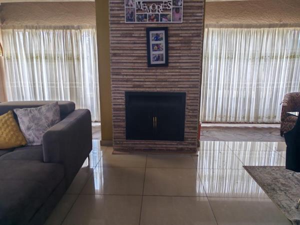 Discover this charming 3-bedroom, 2-bathroom residence located in the established Modder East suburb of Springs, South Africa. The home presents a welcoming kerb appeal with a well-maintained light brown stucco exterior, a classic red tile roof, and neatly trimmed landscaping, complemented by a brick paver pathway. Inside, the property boasts spacious, brightly lit living areas featuring modern tiled flooring and an inviting open-plan layout. The main living room is enhanced by a prominent stone-clad fireplace, creating a warm focal point, alongside recessed lighting and a contemporary chandelier.