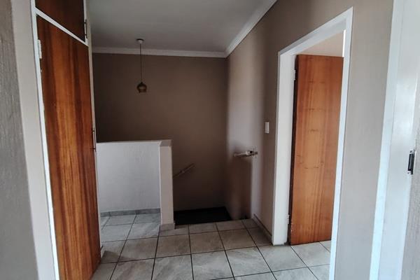 The residence features three generously sized bedrooms, each adorned with built-in cupboards, ensuring ample storage space. A fully tiled bathroom with a separate toilet enhances convenience, complemented by an additional guest toilet with a basin on the lower level.