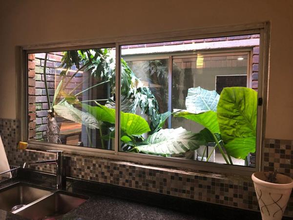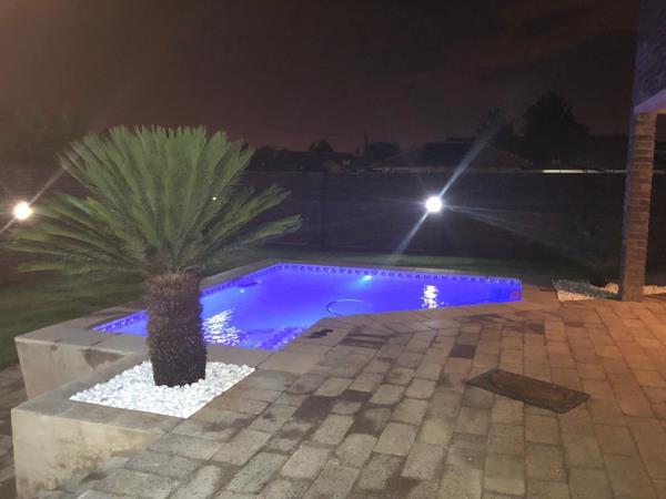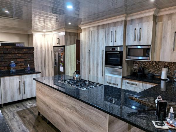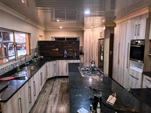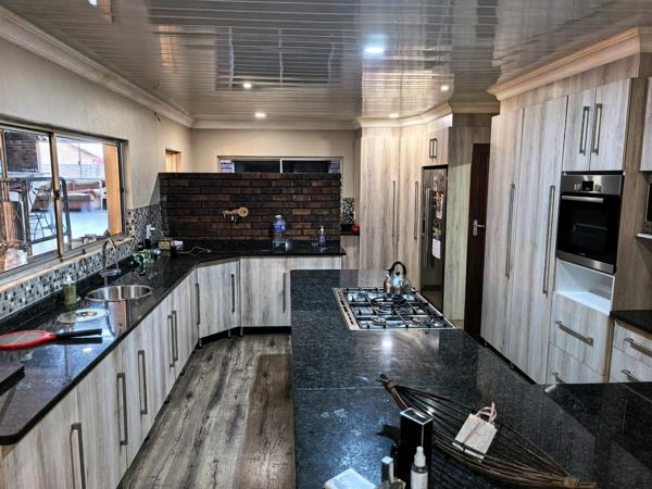 Laminated flooring throughout, entrance hall with big sky light and indoor garden, to study, spacious lounge, open plan dining room and kitchen, modern kitchen, with scullery, gas stove, electric oven every woman''s dream, main bedroom with en-suite bathroom and walk in closet, entertainment area with sky light roof connected to the bar area, with sliding doors leading to pool, gym roof upstairs with balcony, 7 CCTV cameras, electric fencing, .outdoor beams and guard sensors.