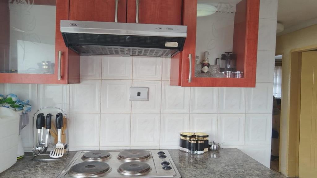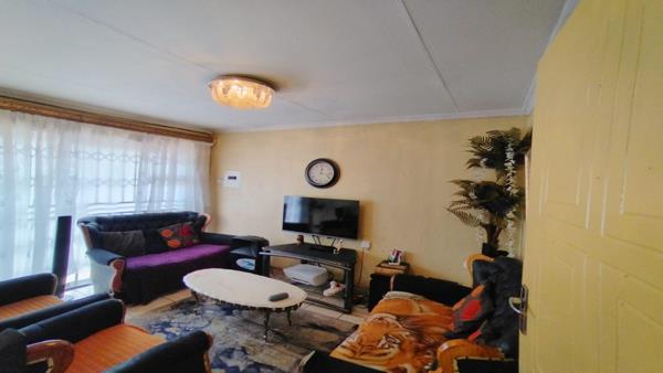 A welcoming and spacious lounge, fully tiled for easy maintenance, ideal for family relaxation, Kitchen has fitted cupboards and tiled floors, Bathroom fully tiled bathroom equipped with a bath, basin, and toilet.