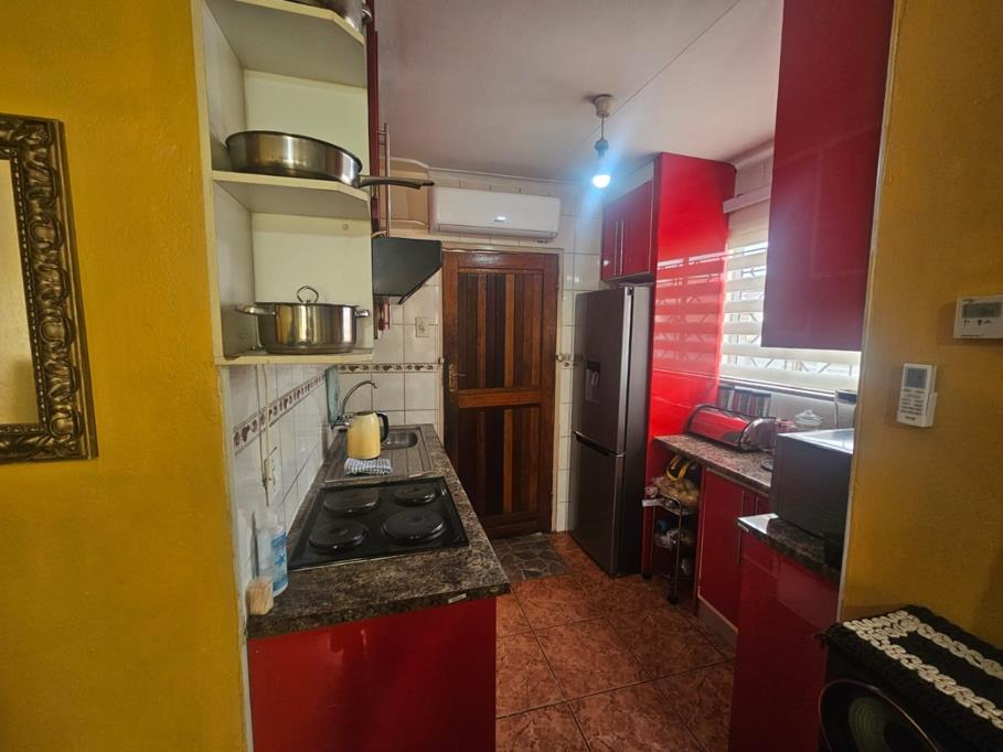 Step inside to a welcoming interior featuring a spacious lounge and a dedicated dining room, both benefiting from natural light through large windows and durable tiled flooring. The living area is designed for relaxation and entertainment, providing a versatile space for family life. The compact yet functional kitchen boasts vibrant red cabinetry, granite-look countertops, an integrated cooktop, and a full-sized refrigerator, making meal preparation efficient. An air conditioning unit in the kitchen adds to the comfort.