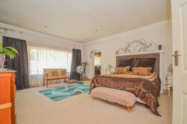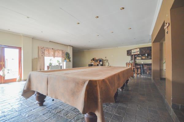 Outdoors, the entertainment area with built-in braai sets the stage for weekend gatherings, overlooking the garden and swimming pool just waiting for a little TLC to shine again and have hours of fun.