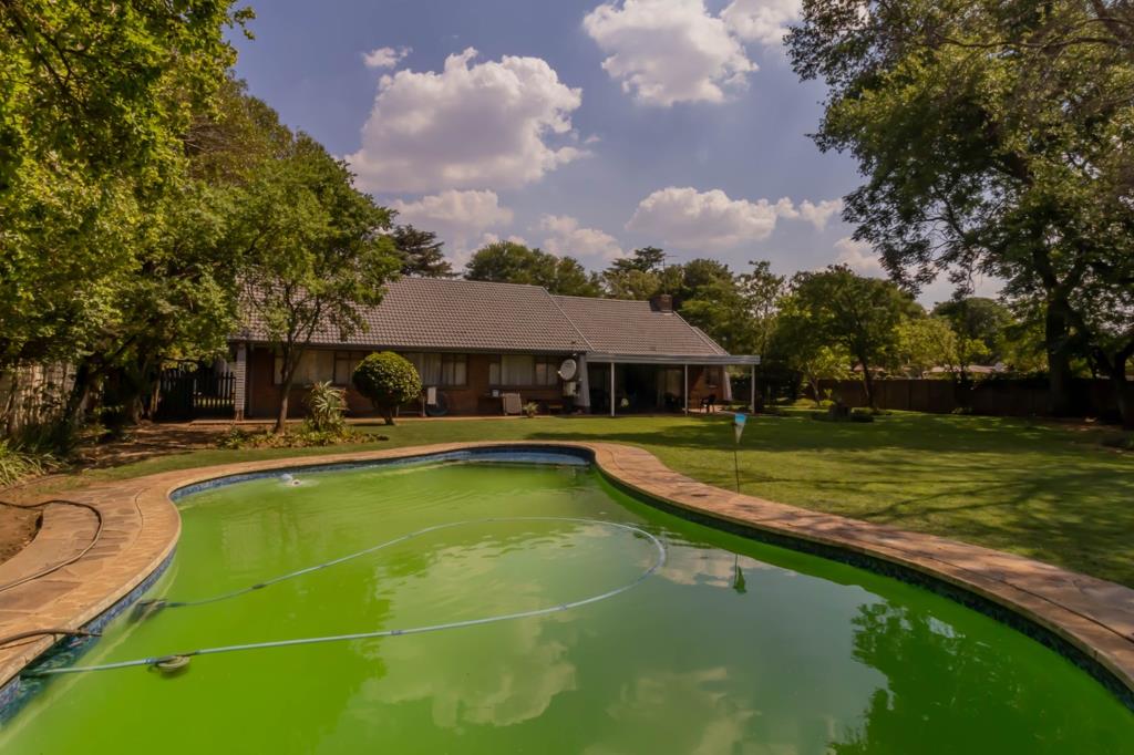 -A sparkling swimming pool set in a lush, established garden, ideal for summer relaxation.