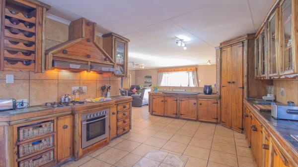 The main house features a generous open-plan living area with a cozy fireplace, dining space and a beautifully crafted solid wood custom made kitchen, ideal for family living and entertaining.