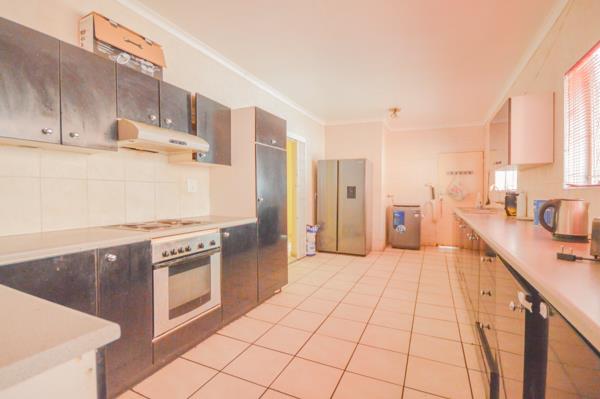 A spacious, fully tiled kitchen with ample cupboards and workspace