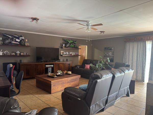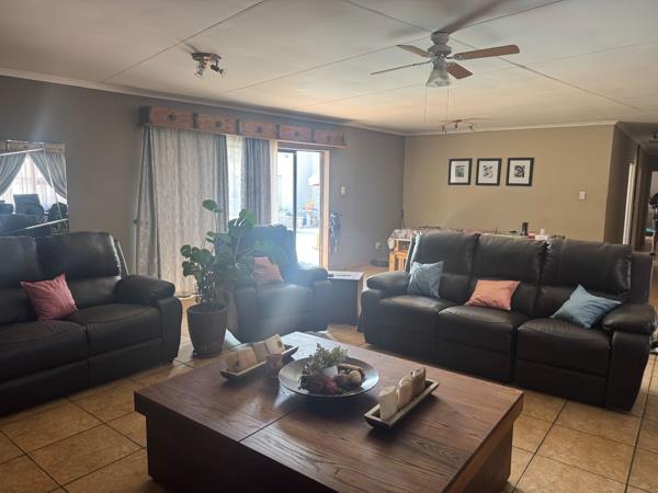 The open-plan kitchen, lounge and dining area is well-suited for family living and entertaining. The kitchen offers wooden cabinetry, tiled countertops, and both electric and gas stove options. Sliding doors lead directly to the entertainment area and pool, while the lounge provides convenient access to the garage.
