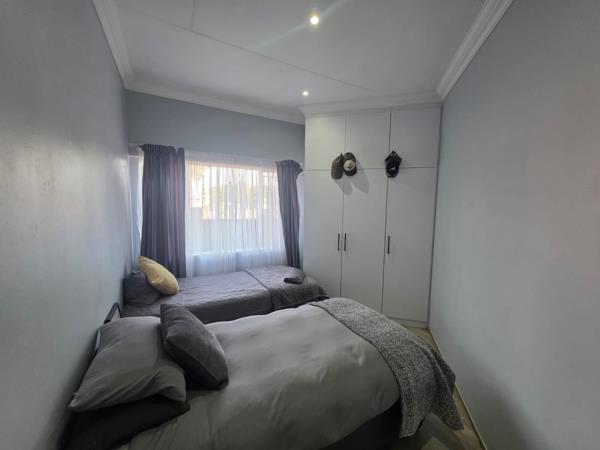 This property features 2 well-sized bedrooms fitted with built-in cupboards, complemented by sleek tiled flooring and contemporary grey wall tones that create a clean and elegant atmosphere.