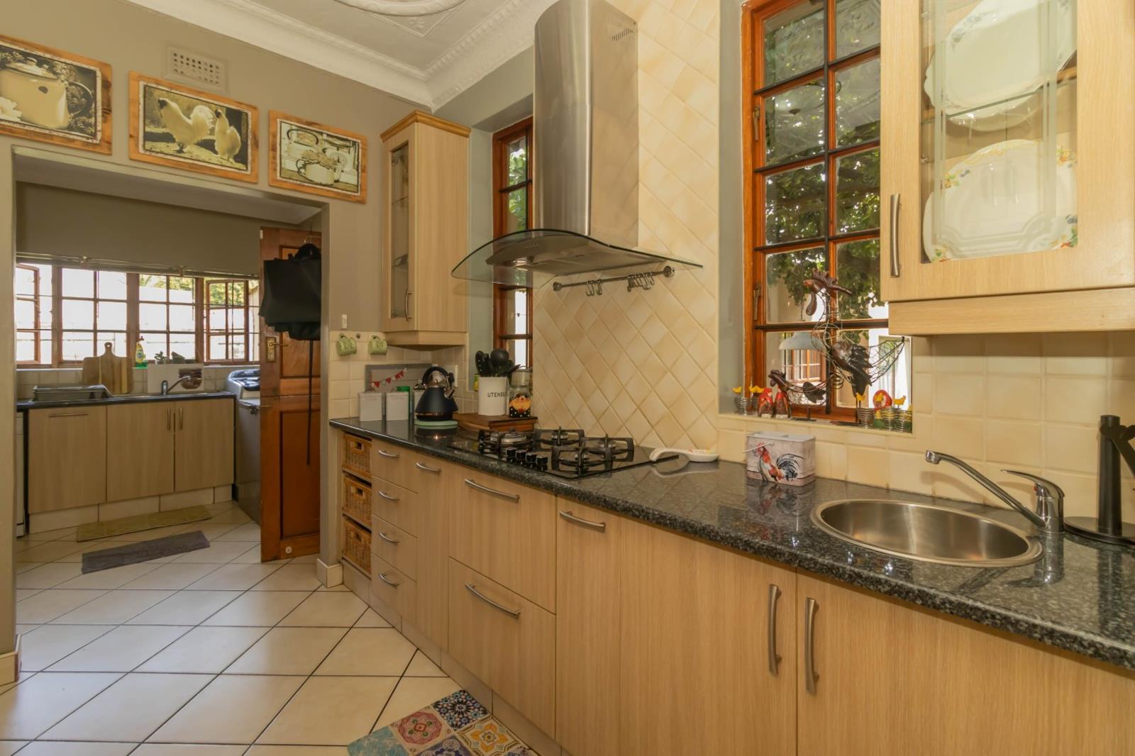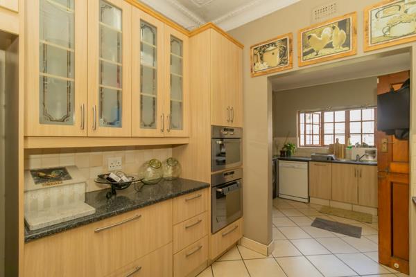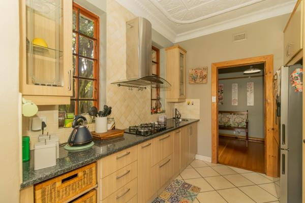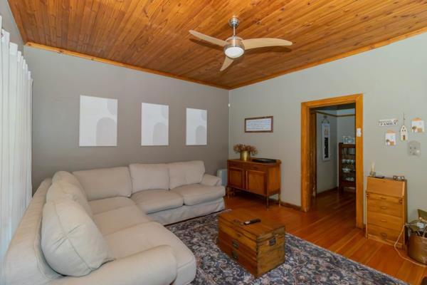 Three sunny bedrooms feature wooden floors, curtain rails and built in cupboards in two of them, delivering versatile spaces for family living. The family bathroom is neatly appointed with full tiling, a shower, basin and toilet, while security measures including an alarm, burglar bars and a security gate provide peace of mind.