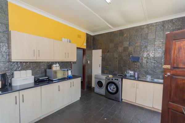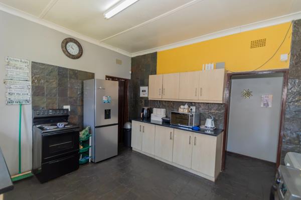 The open plan living and dining areas are finished with tiled floors and offer a seamless flow to the kitchen, where built in cupboards, a gas hob and a stove make meal preparation easy.