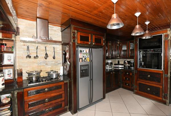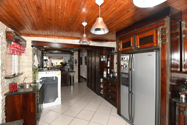 Kitchen: Expansive kitchen featuring ample Rhodesian Teak cupboards, a double eye-level oven, gas stove, breakfast nook, and adjacent dining room