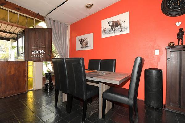 Flowing seamlessly from the lounge, you are welcomed onto a large covered patioperfect for entertaining family and friends or enjoying weekend braais. This inviting outdoor space overlooks a sparkling swimming pool and an expansive, well-maintained garden. The garden further boasts a cozy boma area and additional storage space, enhancing its appeal for outdoor living.