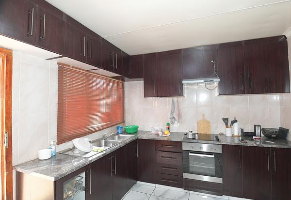The kitchen is well-appointed with plenty of cupboard space, an electric oven, and an extractor fan, making meal preparation both practical and enjoyable. The entire home is neatly tiled throughout and fitted with two air conditioners, ensuring comfort all year round.