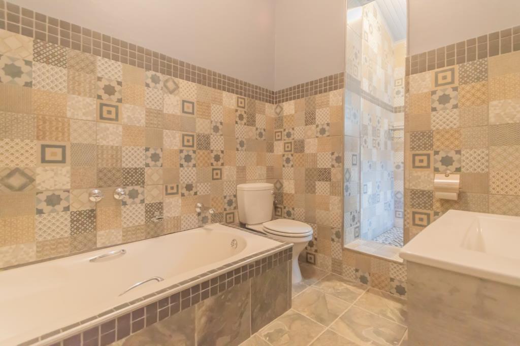 The modern full bathroom has been stylishly renovated and includes a bath, shower, basin, and toilet with clean contemporary finishes.
