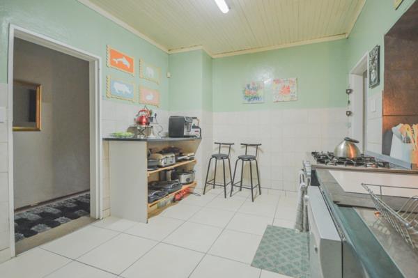 The spacious kitchen is fitted with ample cupboards, offering plenty of storage and workspace for cooking and entertaining.