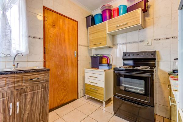 Fully tiled kitchen with cabinets and a stand-alone zinc