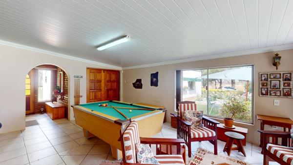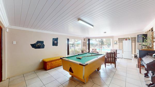 The main house exudes comfort and elegance with five bedrooms, including a master suite with a walk-in dressing room and a full en-suite bathroom equipped with underfloor heating. The second bedroom also boasts an en-suite, and in total, the house has three bathrooms. The main house is fitted with a 300L gas geyser and an optional 200L electric geyser for standby use in the main bathroom. Inside, the home offers ample living space, with a large living room with a cozy fireplace, a dining room, and a study that connects to a peaceful reading room. The reading room opens onto a balcony overlooking the lush garden, providing a serene space for relaxation. The indoor entertainment area leads out to a beautifully manicured garden and a fully fenced, sparkling swimming pool, lapa with built-in pizza oven creating an idyllic setting for outdoor living. The property includes four garages, offering plenty of secure parking.