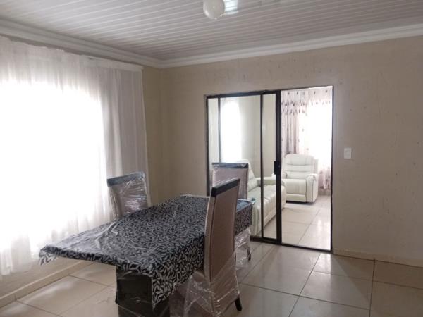 Three -bedroom home in Evaton West. This property offers an open plan lounge, dining room and kitchen.