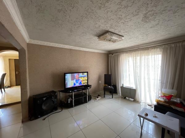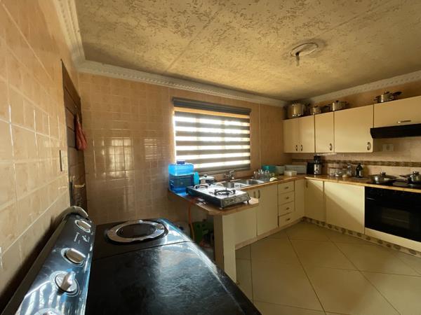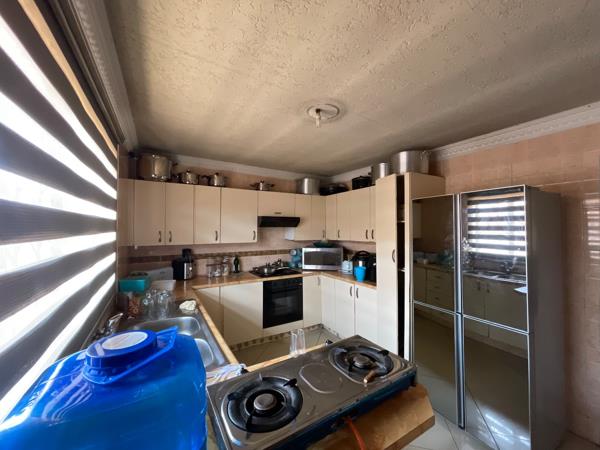 Inside, the home offers a functional layout with a lounge and a dining room, both featuring tiled flooring and benefiting from abundant natural light through large windows. The kitchen is equipped with tiled walls and floor, ample cabinetry, a double sink, providing practical utility.