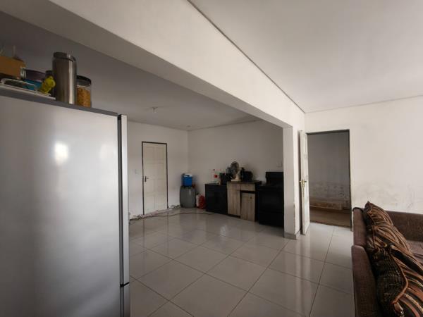 Step inside to an open-plan living and kitchen area, characterized by bright white walls and practical tiled flooring throughout. This layout fosters a sense of spaciousness, ideal for both daily living and entertaining. The main lounge area is generous, offering flexibility in furniture arrangement, while the dining area seamlessly connects to the kitchen. The kitchen is equipped with built-in cabinetry and accommodates a modern refrigerator, providing a functional space ready for your culinary vision. An adjacent utility area further enhances practicality.
