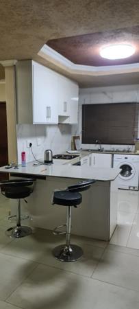 Step inside to an efficiently designed interior featuring an open-plan layout. The modern kitchen is a highlight, equipped with sleek white cabinets, light-colored countertops, and a tiled backsplash. It includes an integrated refrigerator, a built-in hob, and a practical breakfast bar, alongside a dedicated utility space for a washing machine. The adjacent lounge area boasts easy-to-maintain tiled flooring, neutral walls, and a decorative tray ceiling, creating a comfortable environment for relaxation and entertaining.