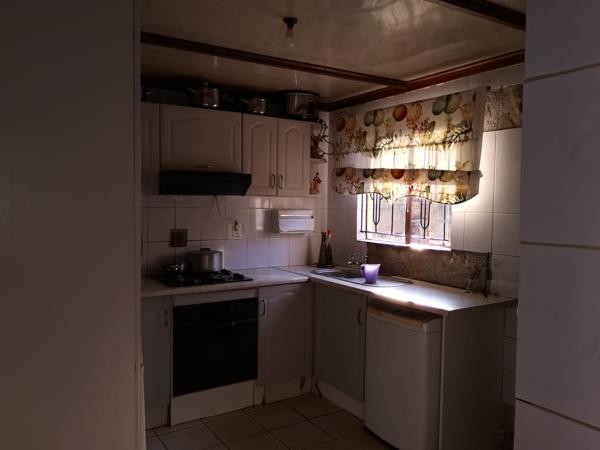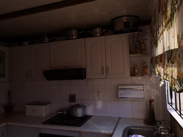fenced in by a facebrick fence and iron gate. Inside the kitchen are built in cupboards with