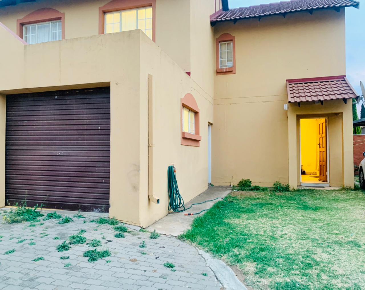Downstairs, the open-plan kitchen flows seamlessly into the lounge, providing easy access to a quaint private garden, making it ideal for relaxation. The entire unit features tiled floors, and both bedrooms come with built-in cupboards. The kitchen also benefits from wall-mounted storage for added convenience. Additionally, there is a garage to help manage access to the complex.