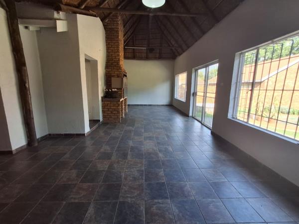 The inviting living room flows seamlessly into a spacious entertainment area complete with a built-in braai and sliding doors that open onto the patio and sparkling swimming pool ideal for hosting family and friends.