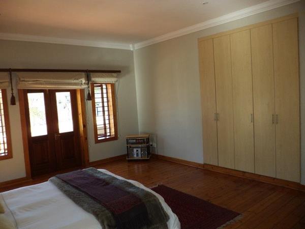 On offer is a warm and inviting entrance hall with direct access to the media/TV room and the large and inviting lounge and living room. The dining room is large with wooden flooring. The kitchen is ideally located with easy access to the dining room, lounge, and outside entertainment area with a one-of-a-kind patio it is large enough for a large 10-seater table and a patio lounge sitting area. The kitchen is fitted with solid rosewood cupboards, magnificent lighting, a disguised scullery, a walk-in pantry, gas stove. A bonus is the separate, underground wine cellar with easy access from the kitchen. The three large bedrooms have wooden flooring, high ceilings and are completely private from the living areas of the house. What makes this utterly unique is that every bedroom has French doors opening onto the large wrap-around stoep, adding a lot of natural light to the sleeping areas and creating a sense of outside coming inside. There are two separate bathrooms with bathroom one having a bath, double basin, and an outside shower. The second bathroom was designed as a wet room to be completely open, and the shower floor is flush with the rest of the bathroom. However, the showering area utilizes a slight gradient to allow water to flow toward the direction of the drain.