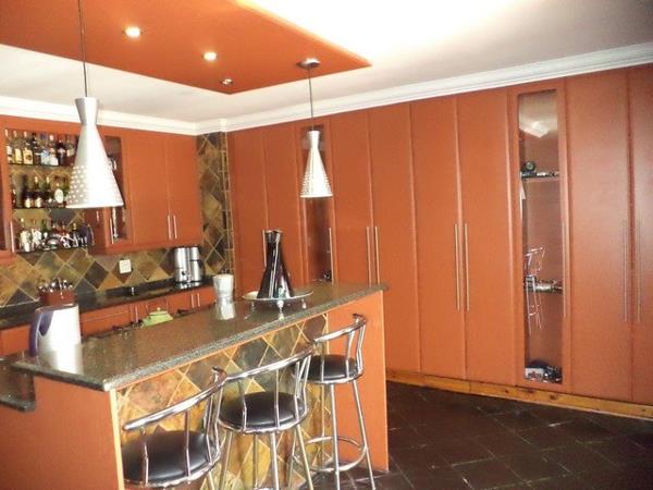 Going outside from the kitchen, the patio is elevated from the garden enabling you to view most of the garden. The pool is built-in on the patio. Another small building is close to the patio which is ideal to be utilized as a private guest suite or an additional office from home. Here is a full bathroom. 3 car garages with a workshop for the avid car mechanic or car racer as well as an additional storeroom. To the side of the garages is an additional entertainment area with a beautiful outside boma to make an outside open fire with a small kitchenette conveniently planned close to this braai area as well. A perimeter wall around the property with palisade fencing on the street side, fitted with an alarm and beams outside.