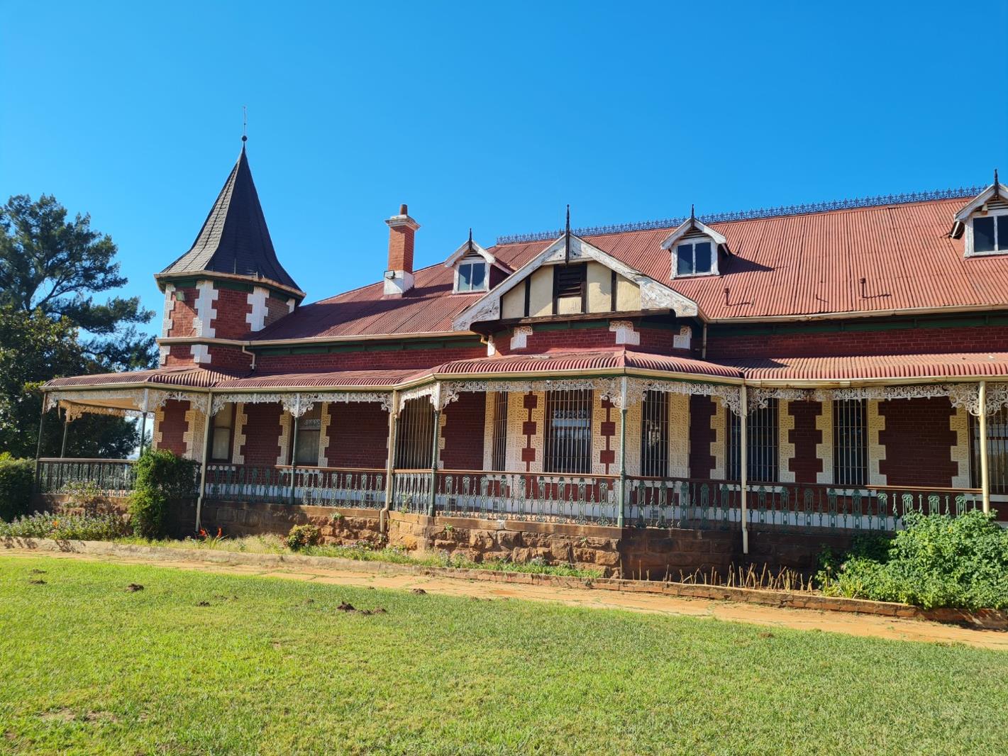 The main residence, spanning 792m, has preserved its charm with original Victorian mouldings, metal pressed ceilings, rosewood fireplaces complete with mantle piece mirrors, and elegant yellow copper finishes. Adorned with colourful lead glass windows, the main entrance and the door leading to the veranda from the gentlemens smoking room are particularly striking. The wrap-around veranda boasts cast-iron balustrades, wooden rails, metal pressed ceilings, and intricate brooky lace decor.