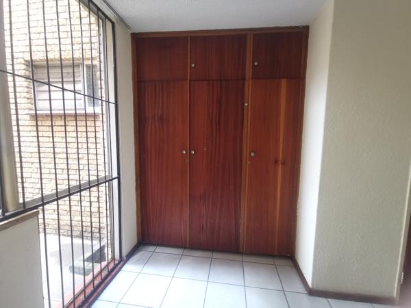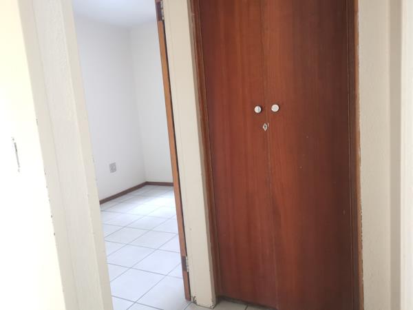 Step outside through the large glass doors to a private outdoor grassy area, offering a small, accessible space for relaxation. Security is a key feature, with security bars installed on all opening windows and doors, complemented by electric fencing and an access gate, ensuring a secure perimeter. The property also includes one dedicated parking bay and the complex is totally walled for enhanced security.