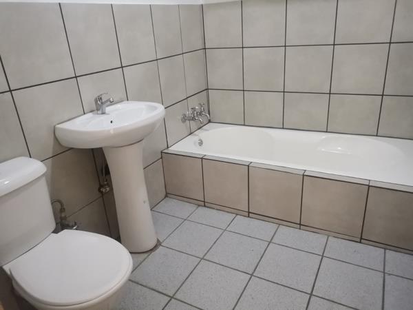 Accommodation comprises two bedrooms, each fitted with practical built-in wooden cupboards, offering ample storage solutions. Large windows and glass doors allow for natural light to brighten these spaces. The single bathroom is tiled and includes a white pedestal sink, toilet, and a bathtub, presenting a clean and functional space.