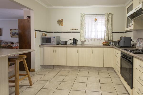 Upon entering, you are welcomed into a light-filled open-plan lounge and dining area that flows seamlessly onto an enclosed patio featuring a built-in braai ideal for year-round entertaining.
