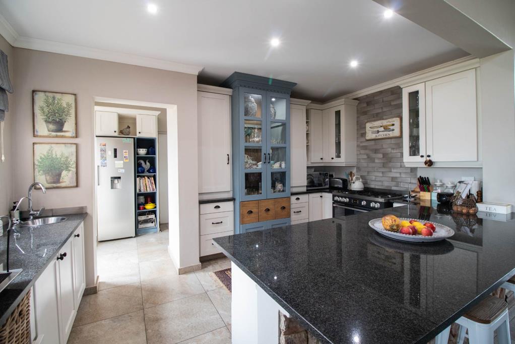 The blue and white farmhouse kitchen is a culinary enthusiast''s dream, boasting a top-of-the-line gas stove and under-counter oven, ample storage space, exquisite granite countertops, and a prep bowl with a water filter system. The kitchen uses a gas geyser. The scullery is large with space for a dishwasher, and washing machine direct access into the house from the garage. The adjoining dining area offers breathtaking panoramic views, providing the perfect backdrop for intimate family meals or gatherings with friends.