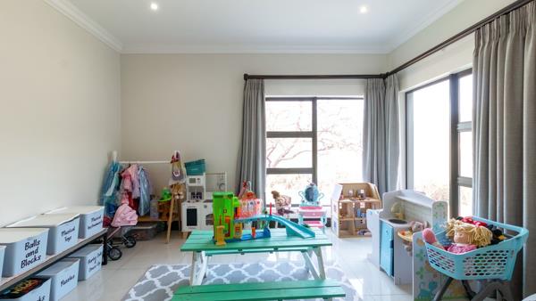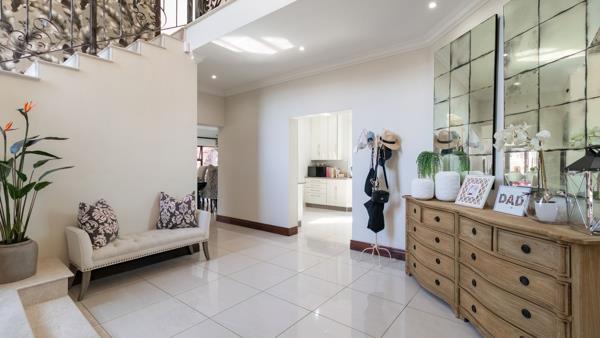 Stepping through the front door, you are greeted by a voluminous double-volume entrance hall that floods with natural light. The lower level flows effortlessly between the open-plan living spaces, creating a perfect setting for both intimate gatherings and large-scale entertaining. A gourmet kitchen, fitted with high-end appliances, sleek cabinetry, and an island, anchors the kitchen area. The adjacent dining and lounge spaces extend to a spacious covered patio ideal for sundowners while soaking in the estates tranquillity. A well-appointed study and a convenient guest toilet complete the lower level, adding both functionality and comfort.