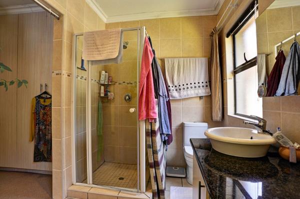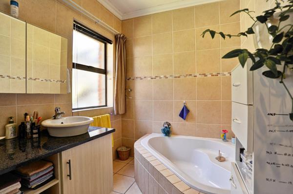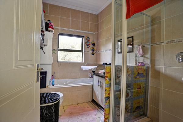 The home offers four comfortable bedrooms, each with built-in cupboards and soft carpeting. The main bedroom includes a luxurious en-suite bathroom with a bath, shower, and double basin. The second bathroom also offers a bath and shower, while the guest bedroom features its own en-suite bathroom with a showerideal for visitors or extended family.