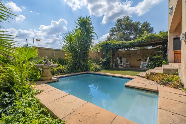The kitchen flows into the spacious family and TV room, which opens up to a gorgeous patio and garden area, offering a solar heated splash pool for ultimate relaxation. Perfect for entertaining, the outdoor space also includes a built-in braai and a separate storeroom with a shower and basin.