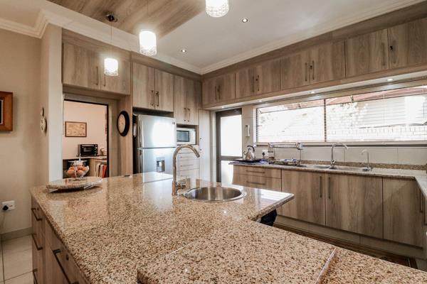 This stunning home offers is a sun-drenched enclosed patio, large open plan lounge and dining room area fitted with a gas fireplace, dazzling and large kitchen with granite tops, electric eye-level oven, warm drawer, prep bowl, gas stove, extractor fan, plenty of cupboard space, double basin, and water filter. A separate workroom/hobby room ideal for extra study is close to the kitchen next to the laundry. There is a lot of work surfaces with melamine tops and again, plenty of cupboards and fridge space.