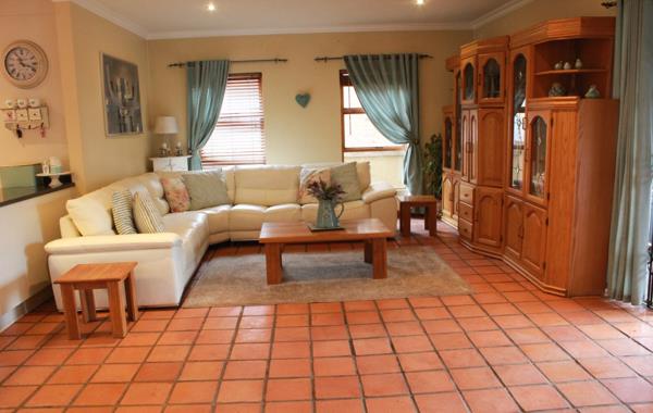 The home features warm terracotta tiled floors throughout, creating a cozy and inviting atmosphere. The spacious open-plan living area includes a lounge, dining room, and modern kitchen with granite countertops. A separate scullery offers space for a dishwasher and washing machine.