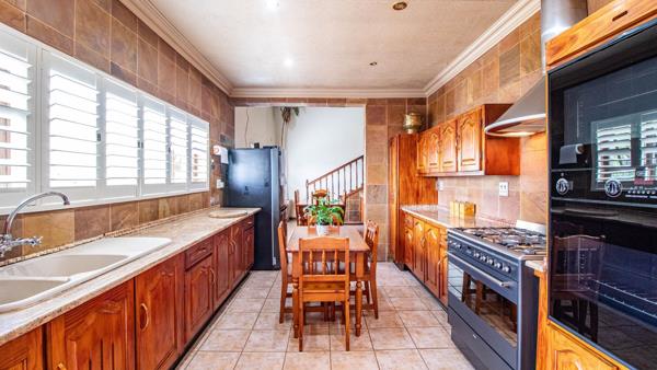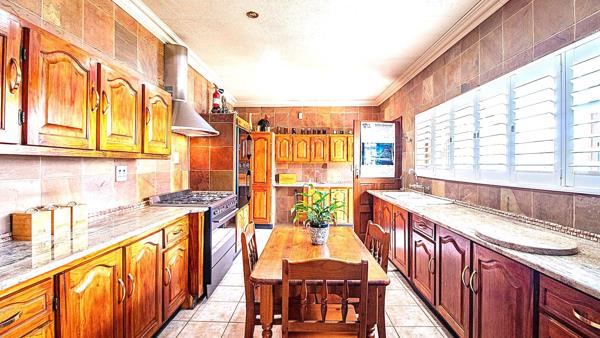Step inside to an inviting entrance hall featuring a warm wooden ceiling and a classic wooden staircase. The interior offers generous living spaces, including a comfortable lounge, a dedicated dining room, and a family TV room, providing ample room for relaxation and entertainment with its own private bathroom. The well-appointed galley-style kitchen is a highlight, equipped with abundant wooden cabinetry, granite countertops, a gas stove, and a built-in double oven. It also features an integrated dining area and multiple windows with louvered shutters for natural light. A separate laundry room and storage facilities add to the home''s practicality.