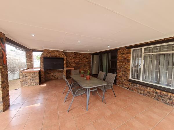 Outdoor living shines with a spacious covered patio and built-in braai, ideal for entertaining. A separate thatched lapa further expands entertainment options. The large garden is perfect for children and pets, while three garages and four additional parking spaces provide extensive vehicle accommodation.