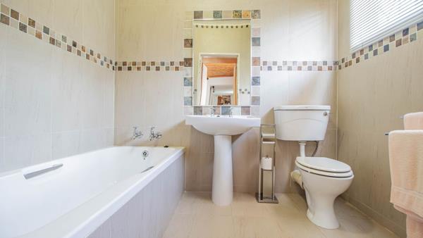 Accommodation includes three spacious bedrooms with the option of a 4th and 5th bedroom, each fitted with built-in cupboards. Two bedrooms feature plush carpets for a cozy feel, while the third boasts durable laminated flooring. The home offers three bathrooms: the main en suite with a bath, a second family bathroom also with a bath, a third with a shower, plus a separate guest toilet for visitors.