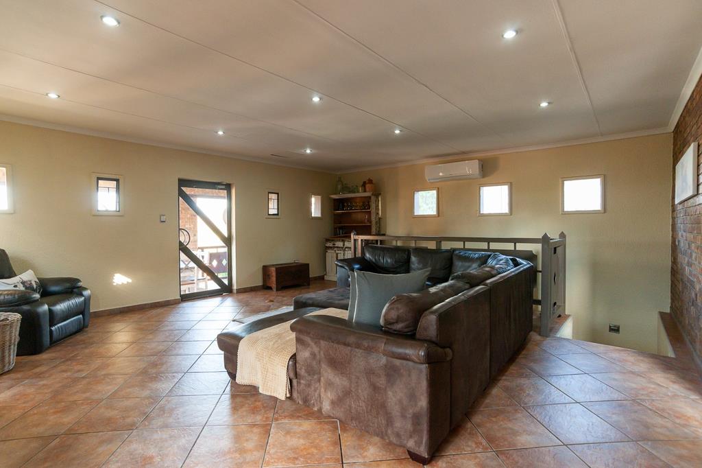 A practical and robust exterior blends beautifully with the interior - set high on the koppie with wraparound views of Overkruin and surrounds of Heidelberg, this home is 425m under roof set on a large stand of 1977m. The accommodation is superior throughout and offers versatility and space in a peaceful suburb of outstanding beauty. Starting with double automated garages and 3-car carports (that offers ample height for a boat or caravan) is a stairway going into the rocky surround to the entrance hall. From the tiled entrance hall, there are stairs going down towards a large open plan dining room, bar and room which is ideal to use as a study since there is direct access into the garage. From the entrance hall is a stunning kitchen with granite tops, double eye-level oven, gas stove, space for a double fridge, scullery with enough space for top loader washing machine, tumble drier and dishwasher.