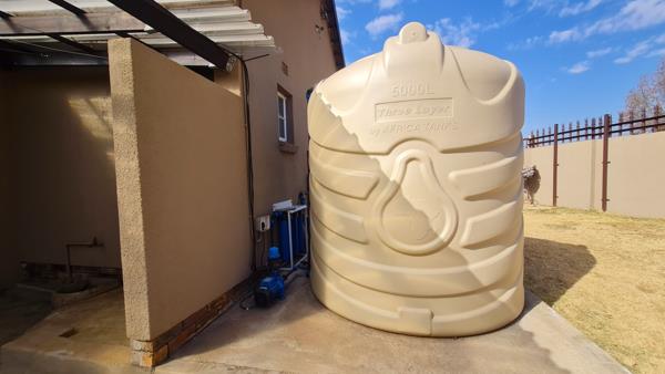 Strong borehole, 5 000l water tank with filtration system and pressure pump ensures constant water supply.
