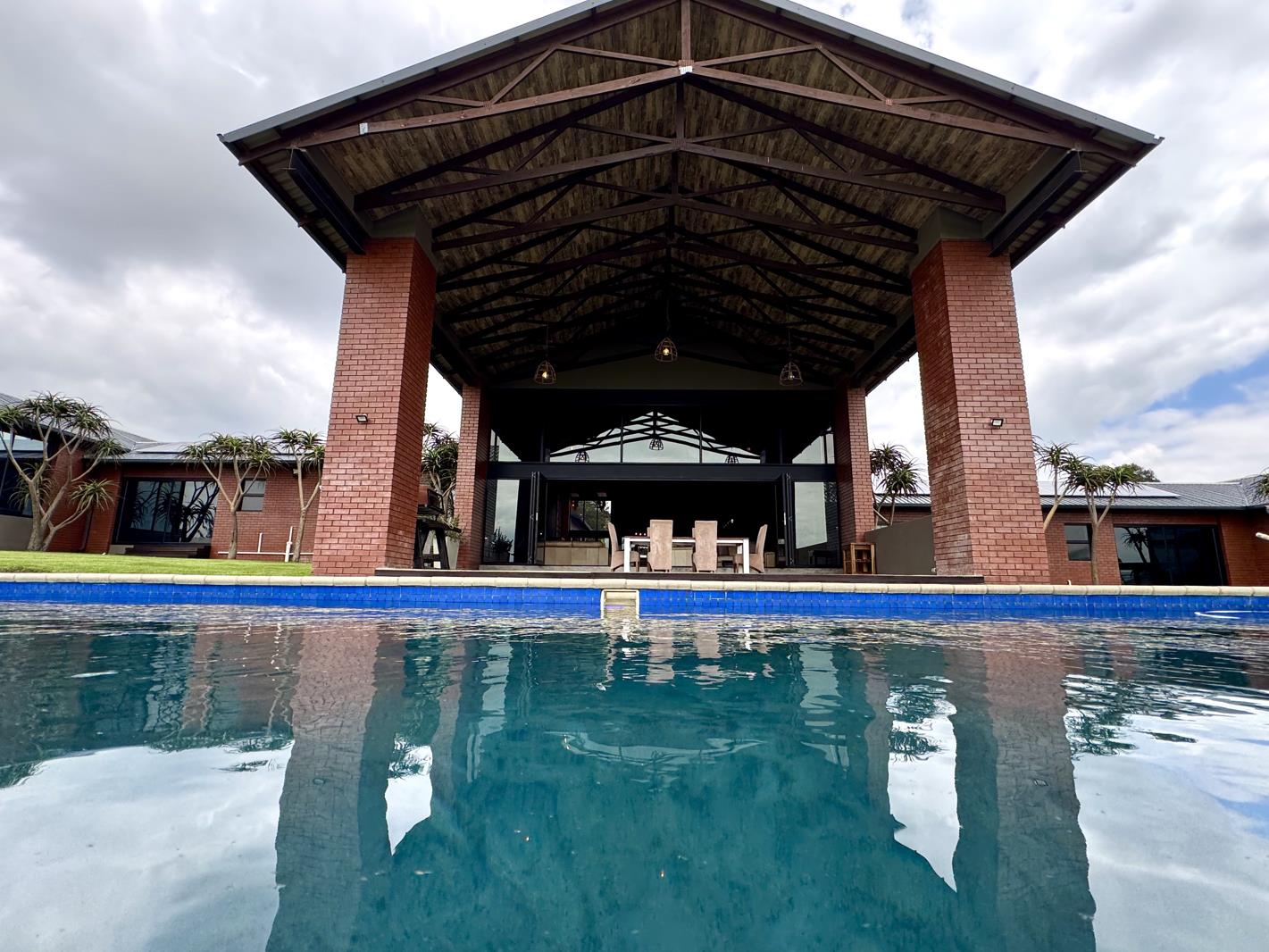 Designed for grand living and exceptional entertaining, the home welcomes you with a breathtaking double-volume living area where natural light, elegant finishes, and multiple fireplaces set a warm, sophisticated tone. The flow is seamless throughout, leading you to a state-of-the-art cinema, an impressive billiard and bar entertainment suite, a private TV lounge, and an expansive undercover patio overlooking a heated infinity pool that frames the sweeping Highveld horizon.