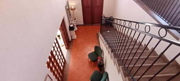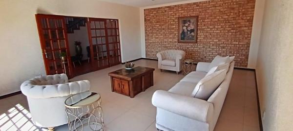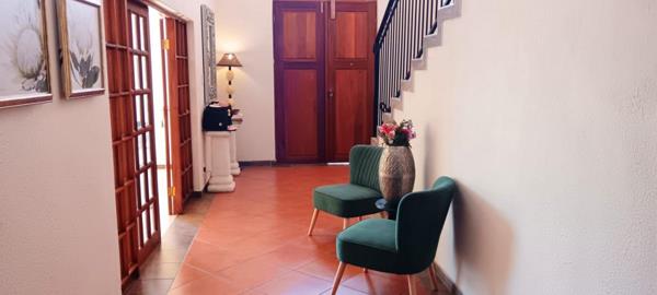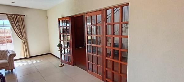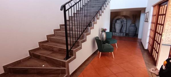 Enter through the impressive hallway, where high ceilings and an open floor plan create a sense of grandeur. A staircase with custom made balustrades serves as a stunning focal point. The multiple very spacious living areas creates a warm and inviting space. High-quality tiled flooring and designer light fixtures add to the rooms elegance.