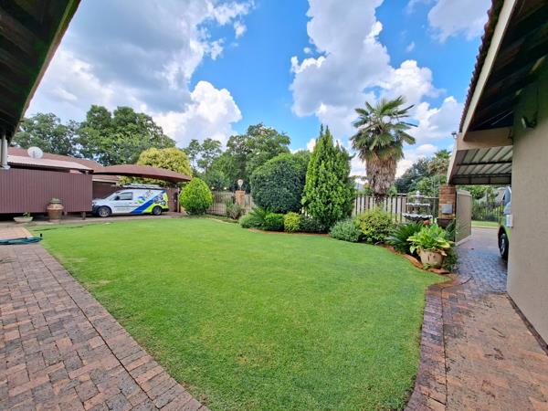 The entertainment area features a built-in braai with sliding doors that open directly onto the sparkling swimming pool, creating a seamless indoor-outdoor lifestyle. The beautifully maintained garden is supported by a borehole and sprinkler system, ensuring year-round greenery with minimal effort.